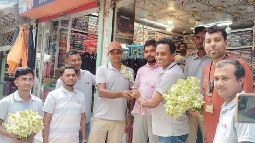 নববর্ষ উপলক্ষে টেকেরহাটে ব্যবসায়ীদের মাঝে ফুল বিতরণ করল ইউসিবি ব্যাংক